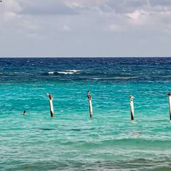 Weil es uns woanders besser gefallen würde, wollten wir zuerst auch auf Cozumel verzichten. Auf anraten diverser Kontakte wäre das aber ein gravierender Fehler. Wir müssten in Cozumel unbedingt tauchen. Dem Gruppendruck halten wir nicht stand und buchen eines Mittags kurzerhand spontan für CHF 25/Nacht ein airbnb auf der Insel, das wir am selben Tag noch beziehen dürfen. So machen wir uns einmal mehr auf den Weg nach Playa del Carmen, um dort unseren Bus einmal mehr vor einem Einkaufszentrum abzustellen (Gratisparkplatz 🙌🏽) und dann die Fähre nach Cozumel zu nehmen. Die Überfahrt dauert ca. 40 Min und für Unterhaltung sorgen unterwegs fliegende Fische.