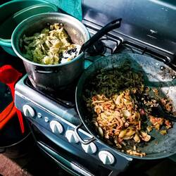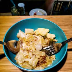 Zum Schluss und zum Abschied kochen wir noch etwas schweizerisches (Älplermagronen) für die rund 15-köpfige Familie. Für uns insoweit auch was neues, weil wir das noch nie gekocht haben.