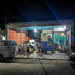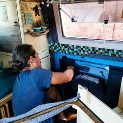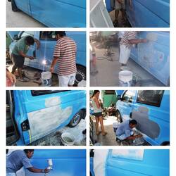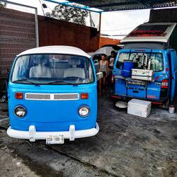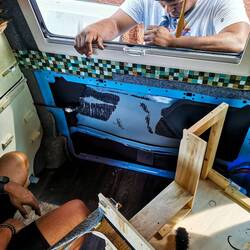 Irgendwie schaffen wir es schliesslich nach Chetúmal wo uns George der Mechaniker in Empfang nimmt. George identifiziert das Problem kurzerhand beim Geberzylinder, den er dann innerhalb von zwei Tagen aus Merida auftreiben kann. Weil wir also ohnehin warten müssen fragen wir noch ob er unsere eingedrückte Fahrzeugseite ebenfalls reparieren könnte. Das sei kein Problem, wird letztlich aber dann zum Grund weshalb sich unser gezwungener Aufenthalt in Chetúmal um einiges in die Länge zieht. Als erstes müssen wir unsere gesamte Küche, sowie Abdeckungen und Isolation ausbauen (bzw. herausreissen). Von innen wird dann das Blech in die andere Richtung gehämmert. Uns wird schon beim Zusehen schlecht. In der Zwischenzeit wird dann unsere Farbe bei einem Lackierer angemischt. Bis dann alles geschliffen, ausgebessert und neu lackiert ist, sind ganze acht Tage vergangen. Und poliert ist die Seite noch nicht. Weil wir mit unserer Geduld am Ende sind, machen wir das dann aber selber. Zuerst müssen (oder dürfen) wir unsere Küche endlich wieder einbauen. Bislang stand das alles kreuz und quer im Bus und wir sind froh jetzt endlich wieder unser eigenes "Zimmer" zurückzuhaben. Am neunten Tag können wir die Werkstatt / unseren Schlafplatz dann tatsächlich verlassen, um auf dem Weg zur Lagune von Bacalar festzustellen, dass die Kupplung nach wie vor nicht funktioniert. Halleluja.