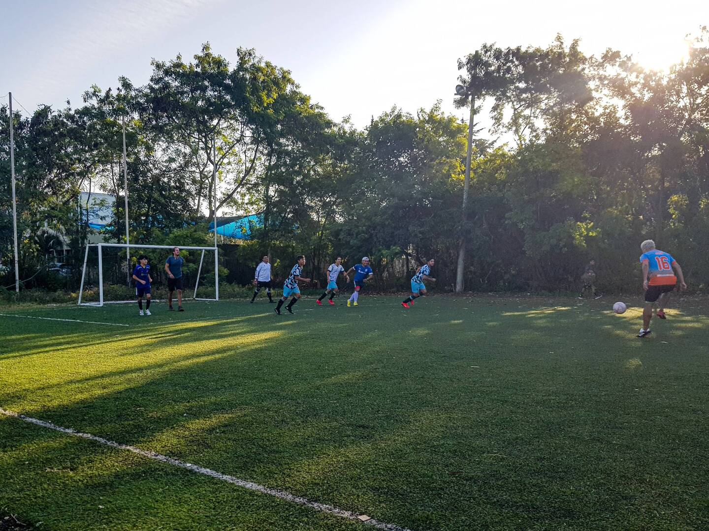 Am Sonntag gehen wir mit Luis (George's Mitarbeiter/Partner) und seinem Sohn an eine Art Familienvereinsfussballspiel. Weil der Gegner nicht vollzählig auftaucht, gewinnt "unser" Team forfait und so darf Simon beim alternativen Freundschaftsspiel mitspielen.