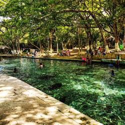 Etwas später sind wir dann mit vollen Bäuchlein an der berühmt berüchtigten Cenote. Wenn wir nicht schon so lange in der Region wären hätten wir wohl nie davon gehört. Jetzt sind wir aber eines besseren belehrt und wissen, dass in einer Höhle in der Felswand neben der Cenote ein Alux* lebt und einen Schatz bewacht. Um was es sich bei dem Schatz handelt konnte uns bisher niemand erklären den wir gefragt haben. Wir gehen davon aus, dass es sich um ein Goldvreneli handelt.