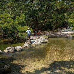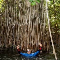 Später gehen wir noch auf eine Bootstour auf dem vom Bach gespiesenen Rio Hondo. Das absolute Highlight der Tour ist, als Dany beim Mangrovenfotoshooting ins Wasser fällt.
