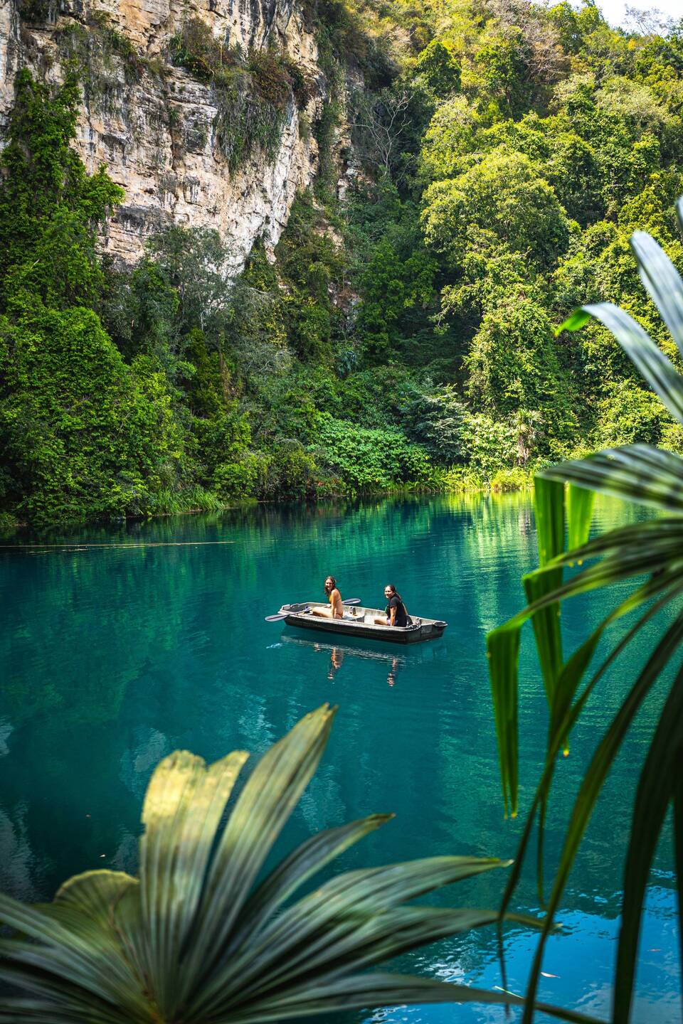 Später erkunden wir die unglaublich grosse Cenote noch mit dem Ruderboot.