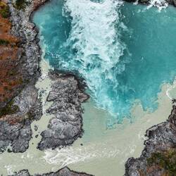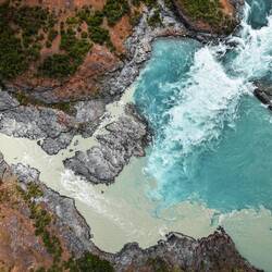 Hier fliessen zwei Flüsse zusammen. Einer ist mega schön blau und der andere nicht.