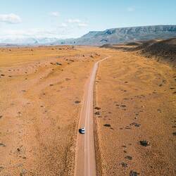 Der Puma streift entspannt durch die Steppe. Da er sich von unserer Anwesenheit nicht stören lässt, folgen wir ihm langsam auf der Strasse. Er überquert sie erneut und verschwindet wieder imLæs mere