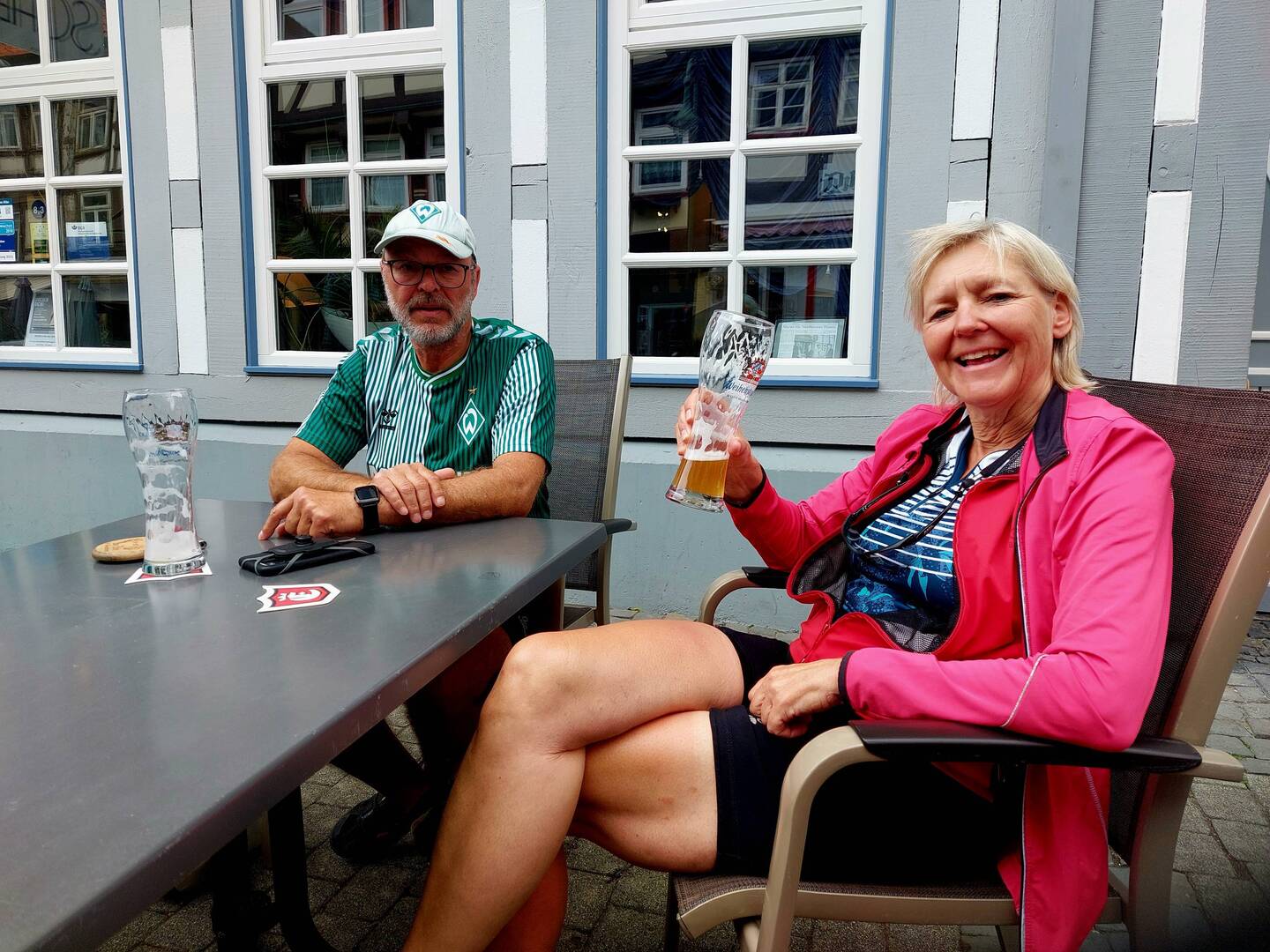 Ankunftsbier, nach knapp 90km, in der Gifhorner Fußgängerzone.