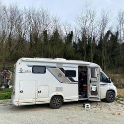 Wir haben eine tolle Nacht auf dem grossen Parkplatz verbracht. Warm scheint am Morgen die Sonne ins WoMo, so macht`s Freude!