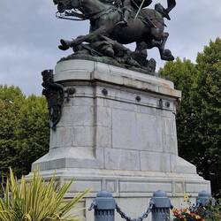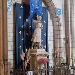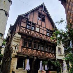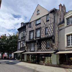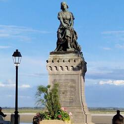 They walk uvver the bridge un get a great view of the chateau up on the hill. The towns full of narrow streets un beamed houses of various colours. They finds the statue of Joan un it's a big un, un they also sees a black London cab un a red telephone box, them a long way from um.