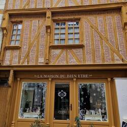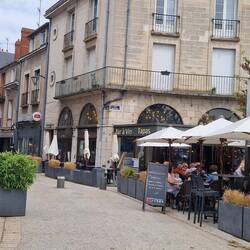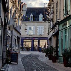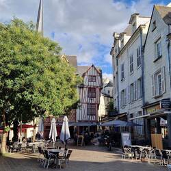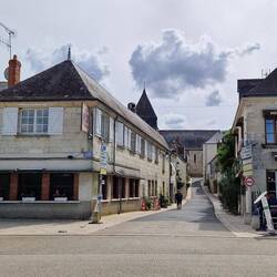 Thems off up the town in search of the market, they walks by the river tu get to it, very pretty. It's not a big place, Blere, but it ay till the last turn of the road that they find it, all half a dozen stalls, not much of interest for um but as per they find a bolangerie for a tart un sum bread.