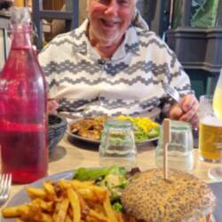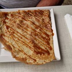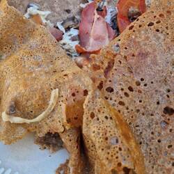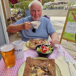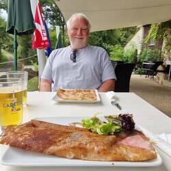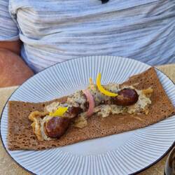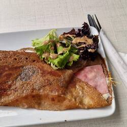 After a quick deco of the menu, they decide on galletts. Her orders one with mushrooms un bacon, un e wants one with a sausage, plus two bottles of Cadette IPA. Well, the good thing about gallettres, they dow tek long tu cook, un the arrive quite quick. Well, the waitress who took the order spoke good English, but the one who brought the food day. They worked out she said foristaire, which er recognised as hers, wi mushroom, she then mumbled summut in French, they both said sausage, as yu does, un her looked blank un put the plate in front of him. Well, tu say he wore expecting that in un understatement. A gallette, potatoes, lettuce, un some of that raw ham, not a sausage in sight. They both look at each other un laffs, then he said e day think it was right, but he'd eat it. Thems tucking in when original waitress cums up, looks at his plate, looks at her un starts apologising, she said she'd orderd the wrong meal, he said he'd eat it but she said no, her ud get him a new plate. Which she ,did un was an happy bunny, he dow like that raw ham.