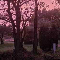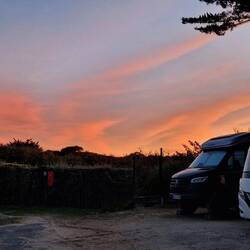 BBQ fu tea, so yes you guessed it, it's pis...g down, thank God for the canopy. Although it's rainy un black as yu hat looking out the front of the van, there's a quite nice sunset uvver the back of the van turning the sky a glorious pink.