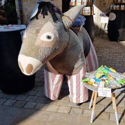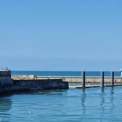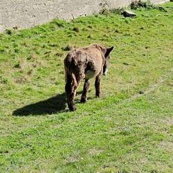 Well, fust stop, yes you guessed it a drink, well it is 1 o'clock un hers gotta tek er pills, good excuse. After, they walks along the right-hand side of the harbour un out towards a lovely beach, passing sum donkeys on the way, but not in trousers.