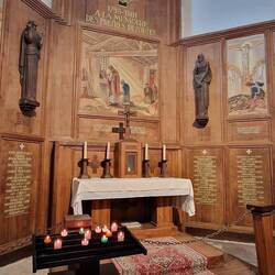 Another little town with narra streets un shuttered house', un a very striking church with a decoratvely painted steeple. They gus inside fur a look, as yu does, very nice with a huge tapestry depicting the island, the needlework is fabulous.