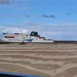 They watches an Irish ferry depart, both thankful they ay on it.