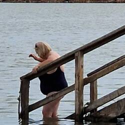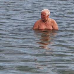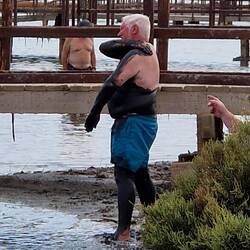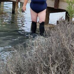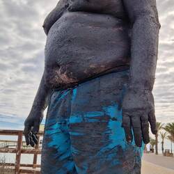 After this, we went to Lo Pagan to bathe in the mud baths in the Mar Menor. The mud is rich in calcium, magnesium, and potassium, good for its healing properties, and also smelt like rotten eggs. There is a long walkway out into the lagoon, on one side is the sea and beach and on the other are little bays with boardwalks leading out into the salt water of the lagoon with a mud bed . The idea is to wade ito the water a pick up the mud and smother the body in it, then get out and let it dry before re-entering the water to wash it off. Well, Mark went first up to his knees, then Martin he started smothering it everywhere, then Fi started off in the water before covering herself up to the knees. I, on the other hand, resisted the ordeal due to the smell. They did actually all say how smooth their skins felt after the experience, I will forgo this experience, but it was fun to watch.