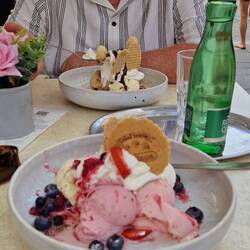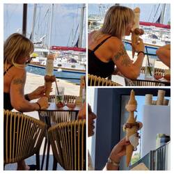 They cycle tu the end of the pathway un hey ho, there's a bar, so no surprises they as a drink un sit un watch the pleasure boats cum in, full off tourists . This bar/restaurant is also doing a roaring trade in ice creams, some are more artistic than others, (anyone for a knob of ice cream?), certainly puts a new spin on 'two scoops'.