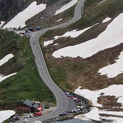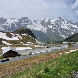 Early start gets us south of Zell am See in Austria and after a fuel top up I start the climb forever upwards. Nice road but bugger me I ay ad to work this hard before, me last owners just lazed around posh caravan sites so I just snoozed most of the time. We had a few stops so I could catch me breath and herself could snap away, and then we med the summit with snow by the side of the road and everything.