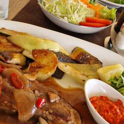 Back on the bikes un they goo of in search of summut to eat, there's a few places tu choose from but nun look as popular as wheere they had their drinkies so they gus back there for food, bass fillet for him un steak for her.