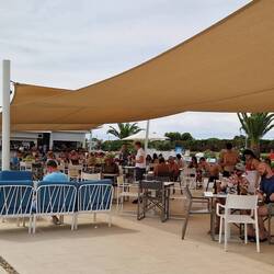 Later they as a walk round the site, it's a big un, with activities, bar, restaurants un hotel. Nice pitches right on the seafront, god knows how much they are, he's paid about €70's a night for our pitch. His credit card is in shock, in un out his wallet, rates here are smacking is gob as they say, but there is no alternative, the big companies offer hotels, mobile homes and camping by the coast and that is what everyone wants, do pay up or piss off, so to speak. Pebbley beach agin but sea is sectioned off for swimming un you can hire deckchairs but them pricey. There's a big grassed area for sun bathing, first bit of grass them seen in about a week.