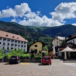 A lot of these towns seems to have double bubble, pretty enough for tourists in the summer un cable cars un ski slopes in the winter, like the town they stops in for lunch, San Candida. There was a stream runnig through the town, a cable car, for the ski slopes in winter un the toboggan run in summer, it was frightnin tu watch, them cum down at a right lick, talking about lick, they as a proper Galeto while they watch the idiots on the toboggan run, they must be mad,