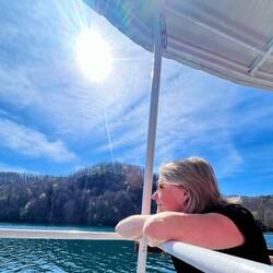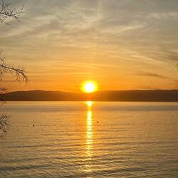Wir essen im Jagdhof zu Abend und genießen die letzten Sonnenstrahlen am Wasser vor der unserem Sam🤩