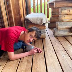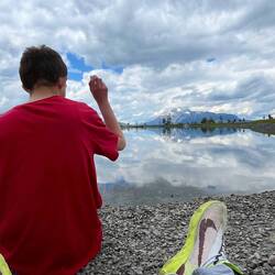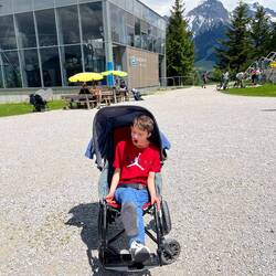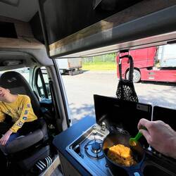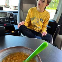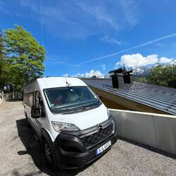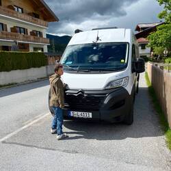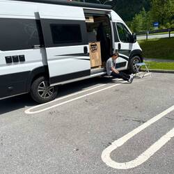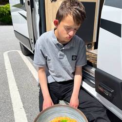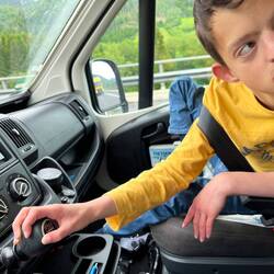Am Plätzchen, mitten in den Bergen angekommen, unseren Sam hingestellt und Lias etwas zum Essen gemacht. Die Mama ist per FaceTime mit dabei🥰