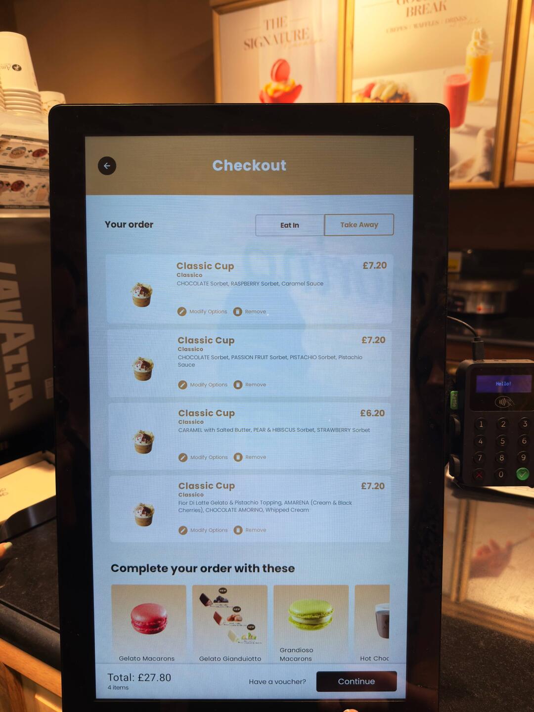 Man kann bei jedem Becher theoretisch so viele Eissorten reinhaben wie man will.