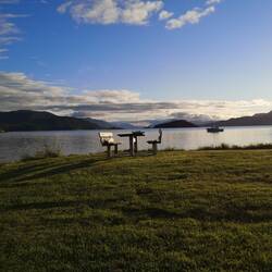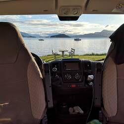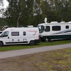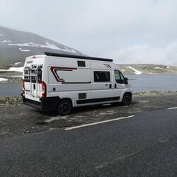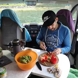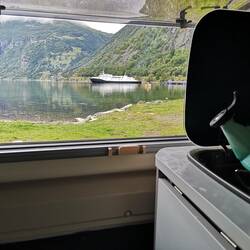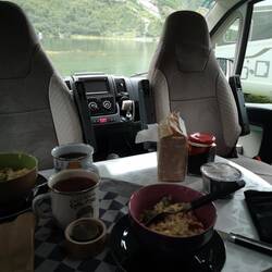 Campen direkt am Fjord und dann noch Michael und Dana getroffen 😄 Erst lecker essen mit Blick aufs Wasser und später gab's leckeres norwegisches Bier im 29 jährigen Hymermobil!! EinLäs mer