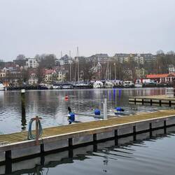 Im Cafe Norderliebe stärken wir uns. Dann geht es weiter zur Flensburger Förde. Unterwegs gehen wir an sehr hübschen Häuschen vorbei. Am historischen Hafen wartet ein Reiher auf uns.