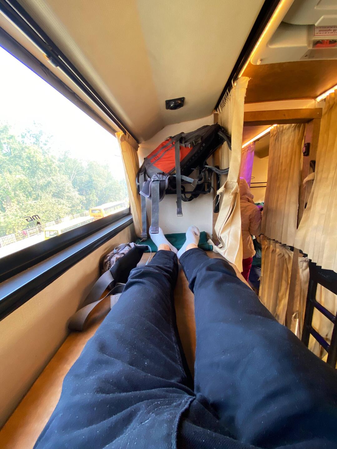 Delhi war mir zu laut, also sprang ich am nächsten Morgen in einen Sleeper-Bus nach Rishikesh, dem spirituellen Zentrum im Norden. Für nur 6 Euro und fünf entspannte Stunden Fahrt ein echtes Schnäppchen. Doch die Nacht war super kalt: Tagsüber angenehme 23 Grad, nachts frostige 11 – alle laufen hier in Winterjacken rum. Und die Ruhe? Fehlanzeige. Rishikesh ist genauso laut und chaotisch wie Delhi, nur in kleiner.