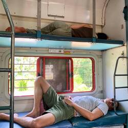 Der nächste Schritt führt mich in die Heilige Stadt Varanasi. 17 Stunden Reisezeit, allerdings nicht ohne Hindernisse: Kurz vor Abfahrt wechselt die Plattform, und ich springe mit einer Gruppe Einheimischer in einen bereits rollenden Zug – eine haarscharfe Sache. Im Inneren irre ich wie ein Verlorener umher, bis ich mich frustriert in die Holzklasse setze – direkt neben einer siebenköpfigen indischen Familie, die kein Wort Englisch spricht. Es wird eine herzliche Begegnung: Zwei Stunden lang kommunizieren wir mit Händen, Füßen und Übersetzung-App. Immer wieder bekomme ich Essen und Trinken angeboten, ohne zu wissen, wie ich mich revanchieren kann.