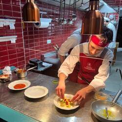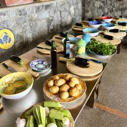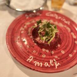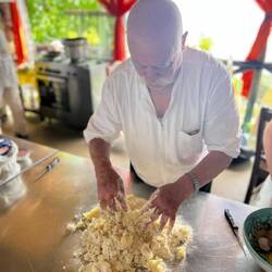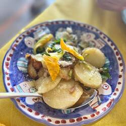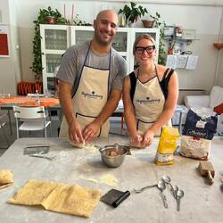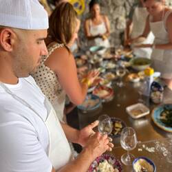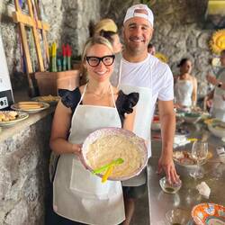 This morning we woke up, and you guessed it— had breakfast at the hotel! I can’t stress how beautiful the hotel grounds are. Terraces of perfectly manicured flora and fauna everywhere you turn. I’ll post pictures, but they won’t do it justice. At 9am, we left the hotel for a cooking class at La Tagliata in Positano. https://www.latagliata.com/cooking-class Little did we know, it was going to be a wine-fueled festa! The class is held at a family owned restaurant and working farm. They have multiple gardens full of eggplant, tomatoes, herbs, onions, peppers… everything you’d need for an Italian restaurant menu! But it doesn’t end with the vegetables. They also have chickens for fresh eggs, rabbits (some are pets, some… aren’t), Guinea pigs (all pets!), hunting dogs, pheasants and other birds, cows, goats and sheep for cheese, a donkey, emu… the list goes on. All well-kept and healthy. Not one unpleasant aroma detected. After picking our own veggies including digging up potatoes which I’ve never done and saying hi to all the animal friends,, we headed back to the class area where we were greeted by the sounds of “Gasolina”, and a ceremonial dance (lol). A lot of gasolina, aka Falanghina, made on site, was served throughout the morning. It was so crisp and delicious— we’re bringing a bottle home. Wish we could bring more! We were then served an assortment of snacks made from the garden, including a delicious olive and hot pepper goats milk cheese. The class started out with dessert— two types of tiramisu. Traditional coffee and a limoncello/orange flavor. Next we moved onto two types of bruschetta, potatoes and zucchini flowers, eggplant Parmesan, gnocchi pomodoro and potato croquettes. In between each project, we’d sit down to eat what we made, or another snack they’d give us, including a house made ricotta ravioli with sauce genovese, which is a pork ragu. Matt and I actually couldn’t even eat the gnocchi and eggplant, so they packed it up for us (I’m not writing this entry in real time— we tried it this morning and it was FANTASTIC. Will be making at home!!). The party— I mean class— lasted until about 3:00… or maybe later! We had to leave because our driver was waiting. Everything here takes a long time, which is just a fact, not a complaint. Anyway, I would HIGHLY recommend this class. It was super fun and super delicious. Go hungry!!! And thirsty 😜.Read more