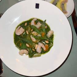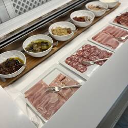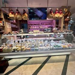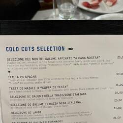 [Matt:] After drinks we headed back to Roscioli for dinner, with a quick little detour to walk through a riverside pop-up restaurant/carnival game scene. Cool set up but nothing special. The restaurant space at Roscioli is in their Deli, separate from the Forno/bakery. The Deli counter itself is extensive, filled with meat, fish, cheese and some prepared foods. The walls are lined with wine and liquor bottles, including some harder to find in Italy scotches, vodkas (bottles that we can easily get at home) priced at a significant mark up. Ex: A 5th of Johnny Black was $200.
