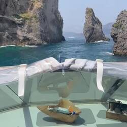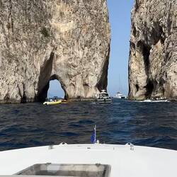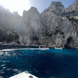 Moving on to the day’s activity. Captain Alfonso picked us up in a 38’ ft beauty directly from the hotel dock. Credit me for organizing. El Capitan took us on a boat tour, heading west from our location past Praiano (a smaller town) and then Positano en route to Capri. Along the way we stopped in a beautiful cove, one of three La Galli islands, mythically known as Le Sirenuse (Same name as the hotel from last night’s dinner).