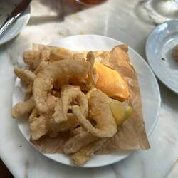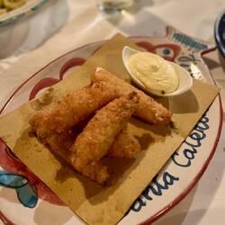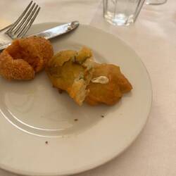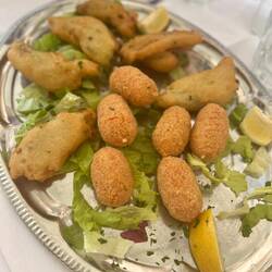 We headed to La Taverna de Ghetto to try some traditional fried treats, which have been perfected by the Jews. Suppli (rice balls with a little “surprise” of melted mozzarella inside) and fried zucchini blossoms stuffed with mozzarella and anchovy were on the menu.