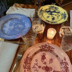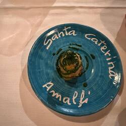 After the class, we took a little breather by the hotel pool, which is on a cliff just about three feet above the sea. You can jump right off your chair and into the Med. Not sure why, but we got cocktails— mine was so delicious; a local, fresh orange juice vodka spritz. Around 4:30, we went back to the room for a costume change and headed about 20 min north east to the town of Ravello. It’s known as the city of music and is famous for festivals, the architecture and beautiful piazzas, which did not disappoint. As is common throughout this region, there were several pottery shops. I finally found a beautiful neutral print and was able to ship several pieces home (https://www.ceramichecosmolena.com/store/?lang=en ). The stuff is basically indestructible, plus it’s microwave and dishwasher safe! Matt and i made a deal- he was allowed to smoke one cigarette if I was allowed to buy the pottery. A good deal for me, I feel. I will admit, the Italians do make smoking look glamorous and fun…