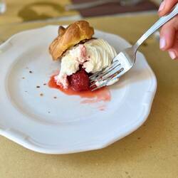This may sound shocking, but after the food tour, we headed to lunch. One of us really limited our tasting on the food tour, one of us did not. Anywhoo, lunch was scheduled at Santo Palato, a small trattoria in a working class neighborhood in rome that has become well known for classic Roman dishes made with impeccable technique. https://www.nytimes.com/2017/12/16/travel/a-new… We started with a “meatball” of wild boar with a peanut sauce and crostino with pickled scapes. Next was pork neck with the most amazing demi and grilled flat beans and cucumbers; we moved on to quintessential versions of carbonara and amatriciana. We finished with a popover filled with yogurt cream and lightly macerated wild strawberries. It was all divine.