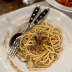 We were feeling a bit of food insecurity regarding our travels the next day, so we stopped at Il Panino Ingegnoso to get some supplies. It must have been fate, because there was a gorgeous porchetta just sitting on the counter waiting for us. We decided to sample a porchetta, olive tapenade and orange panino as our appertivo. We sat outside and enjoyed a quick drink with this bite as they made us our to-go order. Matt agrees, this combo was transcendent. The orange slices were thin, but with the entire rind included, which were the perfect bitter foil to the salty olives and the fatty meat. 10/10 👏🏻. https://www.tripadvisor.com/Restaurant_Review-g…