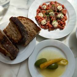 We got back, dropped the bags and of course headed back out for the appertivo hour. We walked across the bridge to get a little different scenery and found several cool new pockets to enjoy. We stumbled up a very cool makers market and got a drink in the Piazza Santo Spirito at Trattoria Borgo Antico (http://www.borgoanticofirenze.com/en). All of the food looked amazing, so we did get one thing— a huge bowl of mussels, clams and langoustine. Sooo good. After a bit more walking, and a quick stop at the hotel for a shower and an espresso martini, it was off to dinner at La Giostra (https://ristorantelagiostra.com/en/). We met a couple named Kevin (half Jewish, very into moon cycles) and Elizabeth (self-made world traveler, from a trailer park, super inspiring) and chatted with them throughout the meal. They actually took home our leftovers, which obviously THRILLED ME. We indulged in a eggplant/zucchini carpaccio, mache salad with oranges and pecorino, rigatoni rosso with fresh mozzarella, a piquant pear and pecorino ravioli and bistecca fiorentina. Oh we also had a tiramisu and warm ricotta cheesecake with red fruit for dessert. The tiramisu was a bit too rich but the cheesecake was unreal. For me, the steak last night was better but I did really enjoy the atmosphere of La Giostra. If I had to pick one, I would go back to Hosteria da Ganino. After a quick exchange of IG handles, and some hugs, it was off to bed! Travel day tomorrow!