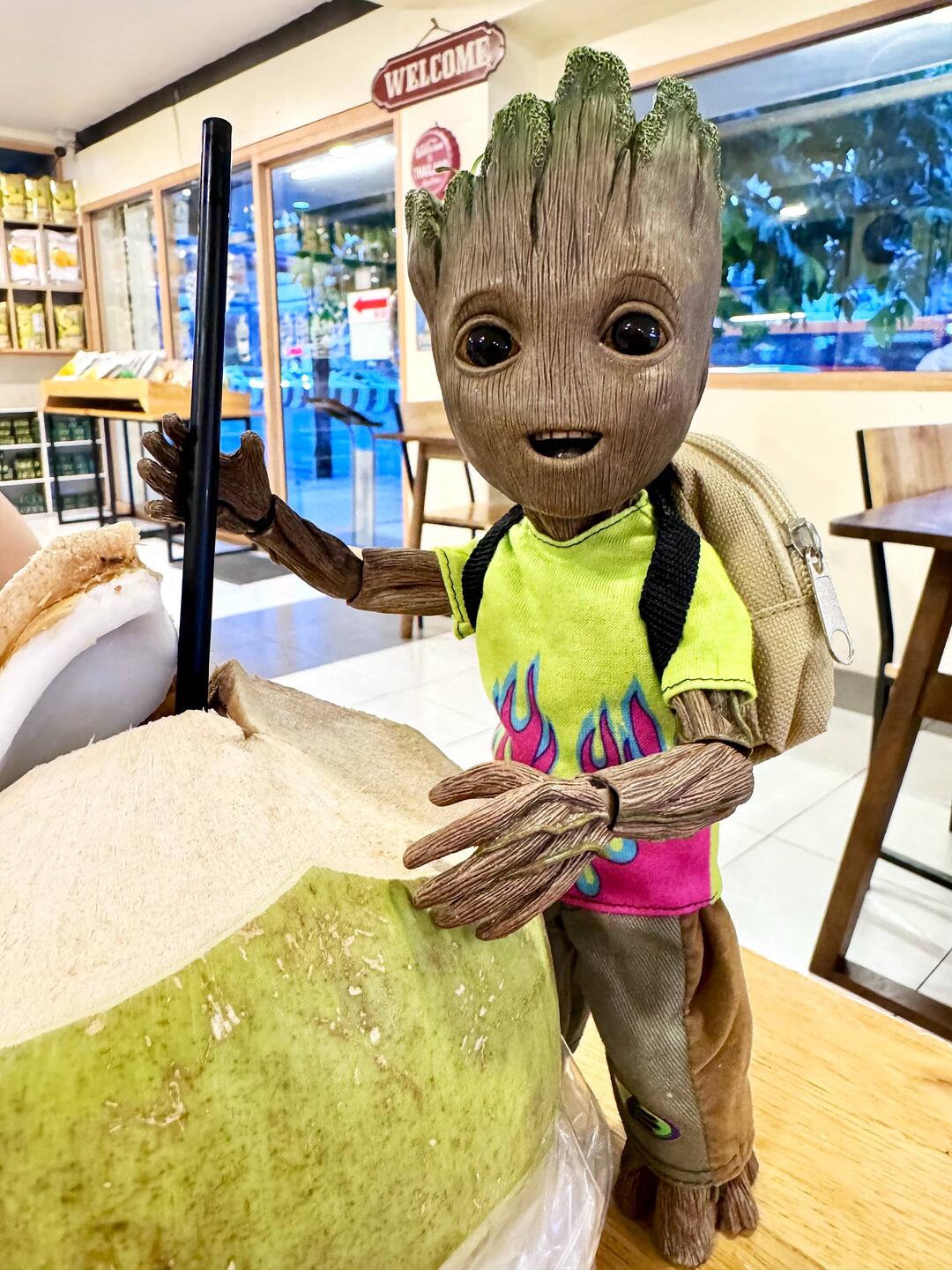 While Kathy and I ate the rice, Groot enjoyed the coconut water. We didn’t care for it but he loved it. He’ll eat or drink nearly anything!