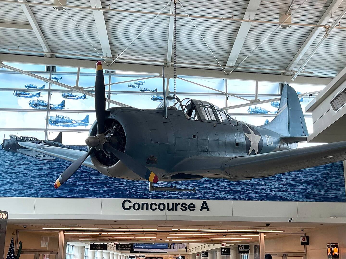 If you go down the hall towards Concourse A, you will see the Battle of Midway Memorial, complete with a Douglas SBD Dauntless dive bomber suspended from the ceiling. Along with the aircraft there areEn savoir plus