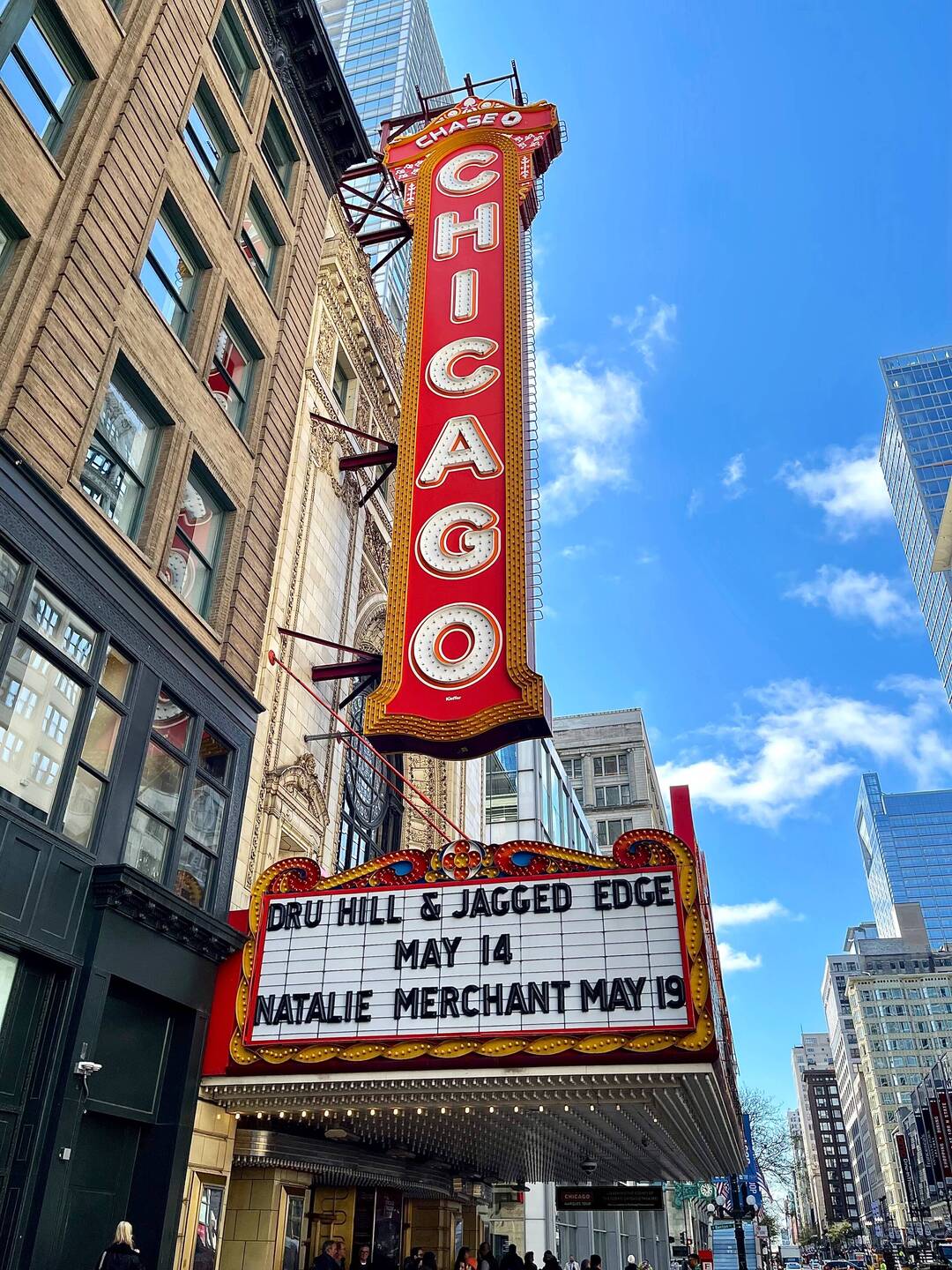 I can see that most of the tour group is here already and it’s nearly time to get started. We’re starting the tour under that big Chicago theater marquee that I was so taken with yesterday. I’mもっと詳しく