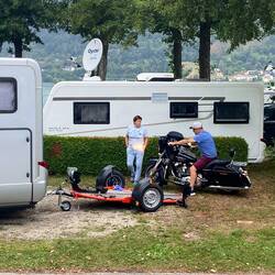 Immer wieder nachschauen ob Anhänger und Harley ok sind.