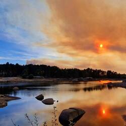Die umliegenden 9 Brandherde haben sich zu einem riesigen Waldbrand entwickelt. Vereinzelt fallen schon Aschepartikel vom Himmel, es riecht brennerig und es ist überall verqualmt.