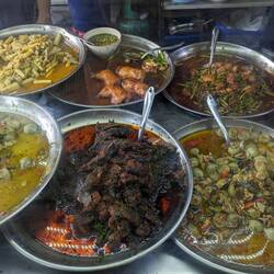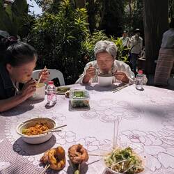 When we got to the main temple courtyard we found that there were lots of decorations and locals preparing a feast. Apparently we happened to go up there on the 650th celebration of the temple andLeia mais