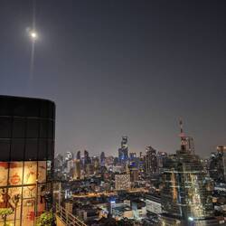 We whizzed up to the 32nd floor of the Hilton to see the sunset and the awing Bangkok skyline at night. Also... the full moon in Virgo! Just the one which marked the beginning of the last year'sLeia mais