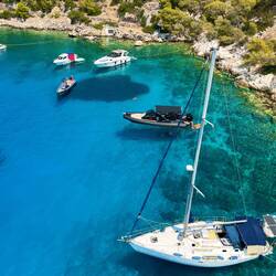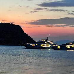 Die Bucht, die von zahlreichen Yachten und größeren Motorbooten bevölkert war, begeisterte mit ihrem kristallklaren Wasser, das Sichtweiten von über 10 Metern ermöglichte. Die Abendstimmung, geprägt von der rot glühenden Sonne, die hinter dem Horizont versank, und den strahlenden Lichtern der Yachten, bot ein magisches Erlebnis. Immer wieder erhellte eine Sternschnuppe den funkelnden Sternenhimmel.