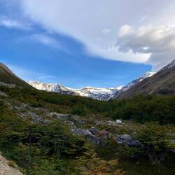 La dernière heure jusqu'au sommet est recouverte de neige c'est très glissant, un peu dangereux pour être honnête car c'est très exposé mais on s'en sort sans soucis. Il y a des nuages qui cachent une partie du cerro Castillo mais la vue est magnifique. Un lac surplombé par les remparts du cerro et au fond une vallée recouverte d'arbres rouges.