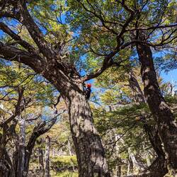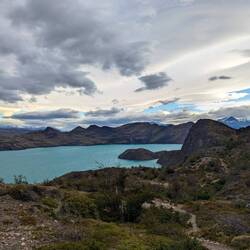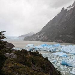 Arrivés au mirador Grey, il commence à pleuvoir et en fait le glacier est assez loin... Néanmoins on voit des icebergs qui se sont détachés et qui ont dérivé pour s'amasser dans le coin en contrebas du mirador. Les couleurs sont magnifiques et la pluie continue à s'abattre sur nous. On décide de repartir sous la pluie et de se dépêcher pour arriver avant la nuit. Sur le retour, au détour d'un buisson un énorme oiseau s'envole dans ma direction. Autant vous dire que j'ai agité mes bâtons devant moi avec beaucoup de grâce. il se pose sur le chemin en nous bloquant le passage. C'est un rapace, un aigle de Patagonie plus précisément, c'est assez unique comme moment et il finit par nous contourner lentement sans voler en marchant tranquillement.