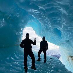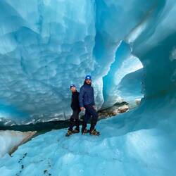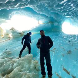 On continue de marcher pendant une bonne heure jusqu’à enfin atteindre ce qu’on imagine tous quand on pense à un glacier. Là on met les crampons et on commence LA randonnée. Franco nous explique comment marcher pour pas glisser, surtout dans les descentes, puis après environ 1h de marche, on finit par s’engouffrer dans une caverne de glace. A l’intérieur, c’est l’Age de Glace (le premier bien sûr, le meilleur). La glace au plafond fond et devient pluie, tandis que celle au sol se durcit et devient plus glissante. On y va donc avec douceur et délicatesse (c’est tout nous!) et on arrive finalement au bout sans tomber, où on découvre un point d’eau sur lequel on se permet quelques ricochets, avant de remonter et de manger notre déjeuner. Au menu, barres de céréales! Le déjeuner finit, on reprend le chemin inverse pour rentrer au camping.